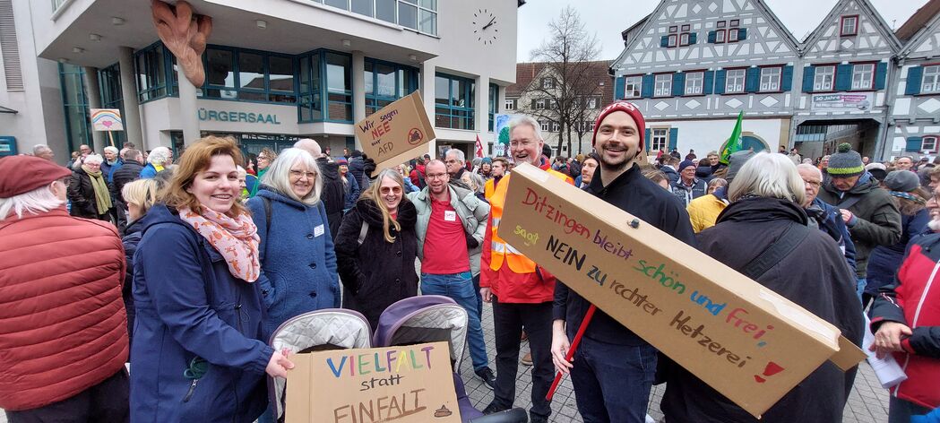 In den Redebeiträgen wurde eindringlich vor der Demokratiefeindlichkeit, die von rechts ausgeht, gewarnt. Unsere Demokratie muss verteidigt werden und es ist gut zu sehen, dass so viele Menschen in Deutschland, und jetzt auch in Ditzingen dafür, auf die Straße gehen und Flagge zeigen.