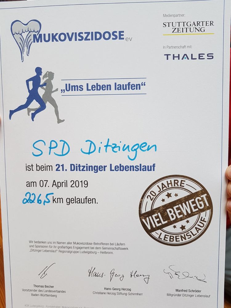 Auch dieses Jahr war die SPD Ditzingen wieder beim Ditzinger Lebenslauf dabei und hat fleißig Kilometer und Spenden für den Mukoviszidose e.V. gesammelt.